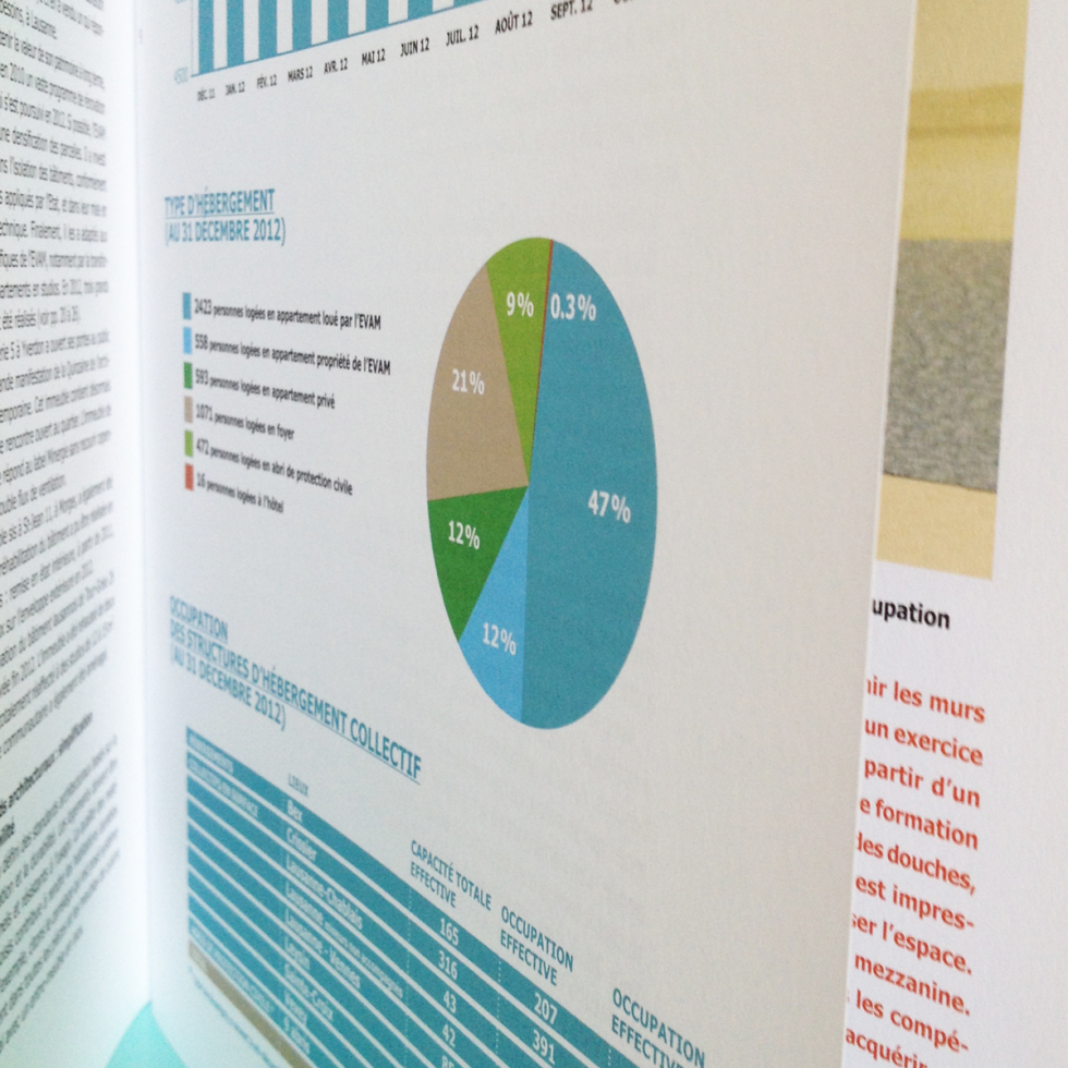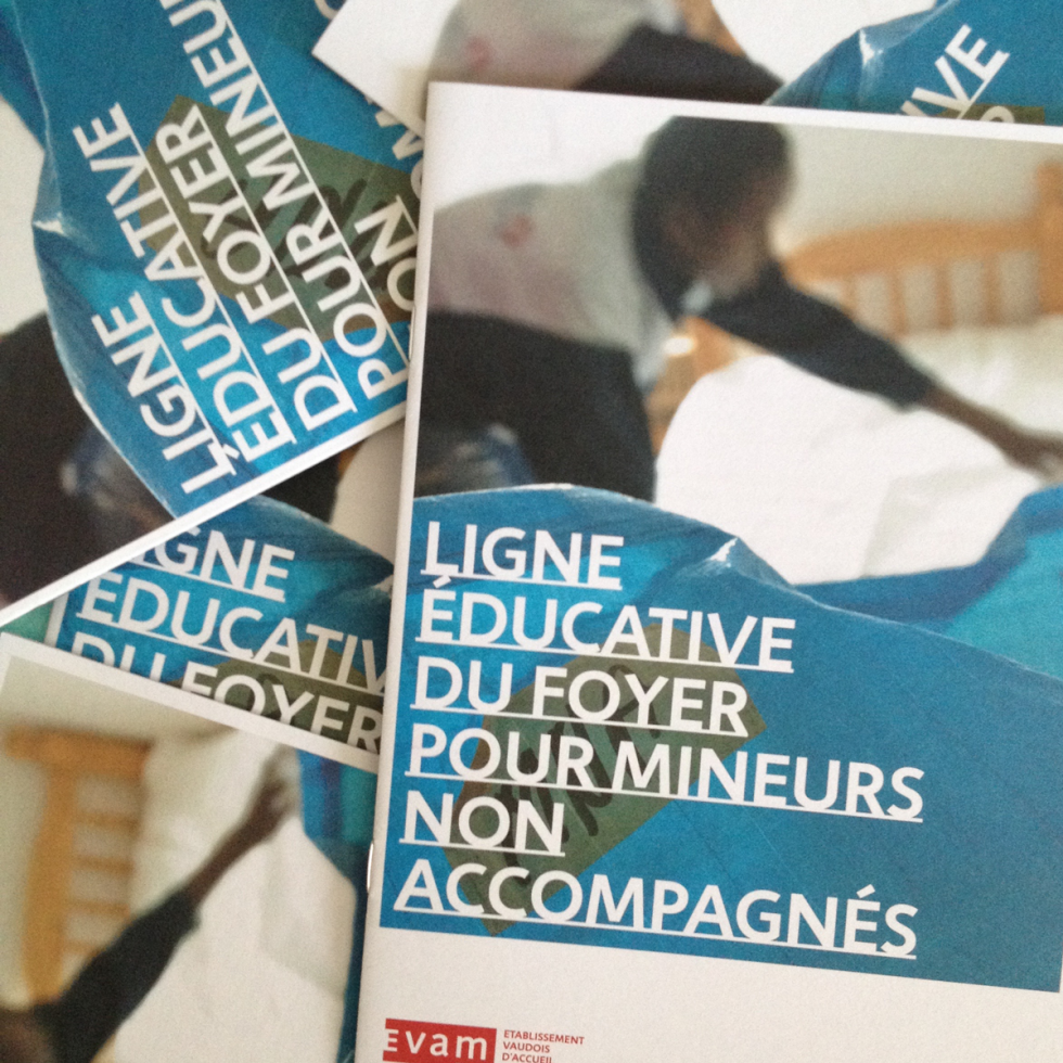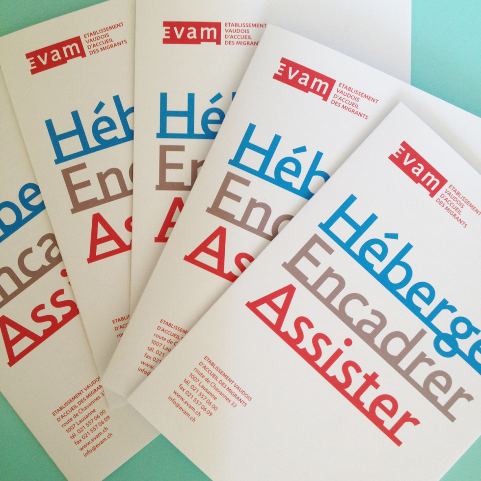 Identité visuelle, rapports d'activité, brochures et dépliants d'information, réglements de maison illustrés, site internet, etc. Client Etablissement vaudois d'accueil des migrants EVAM